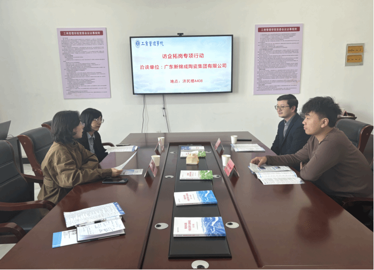 为推动2025届毕业生就业工作,搭建优质就业平台,近日,我院邀请广东新锦成陶瓷集团有限公司人才发展高级主管李广斌入校洽谈合作,院党委副书记肖斯敏,市场营销教研室主任胡银花、辅导员雷巍参加此次洽谈。