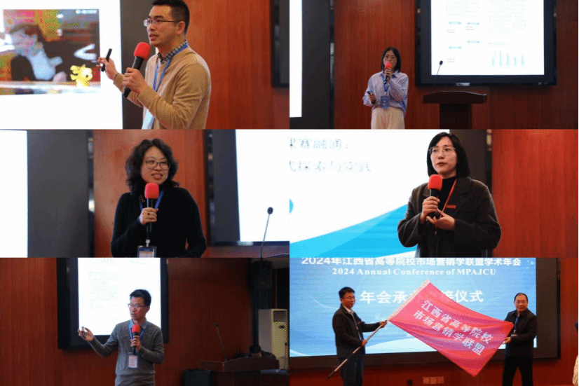 此外,东华理工大学经济与管理学院副院长赵建彬教授、江西财经大学市场营销系主任赵星副教授、景德镇陶瓷大学陶瓷数字经济产业学院执行副院长许剑雄副教授、珍岛集团院校事业部区域总监杜弦、我校william威廉中文官网市场营销教研室主任胡银花副教授分别从市场营销学术研究、学科建设、专业建设、产教融合、人才培养等视角作了专题分享。新余学院和江西飞行学院分别作为今年新加入联盟的高校代表展示了新成员风采。最后,赣南师范大学经济管理学院副院长孙剑斌,代表下一届年会承办单位致闭幕词,并表达了对2025年江西省高等院校市场营销学联盟学术年会的期待。大会举行了下届年会的承办交接仪式。