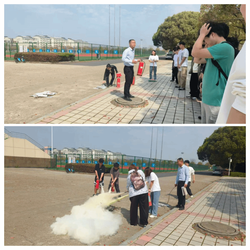 培训伊始,徐小平从灭火器的基础分类讲起,深入浅出地向同学们介绍了不同种类灭火器的适用场景,让同学们对各类灭火器的特性有了清晰的认知。在干粉灭火器使用演示环节,徐小平着重强调了“提、拔、握、压”四字口诀,并亲自示范规范操作:站在上风口约1.5至2米处,确保自身安全,将灭火器喷嘴精准对准火焰根部喷射。理论讲解结束后,现场模拟了由枯树枝和报纸搭建的火源场景,为师生提供了宝贵的实践机会。师生们热情高涨、踊跃参与,纷按照所学规范步骤操作灭火器,成功扑灭明火。