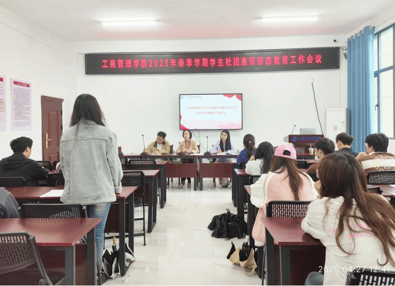 为进一步推动学生社团规范化管理,了解学生思想动态,把握正确政治方向,4月27日中午,我院在济民楼A412开展春季学期学生社团意识形态教育工作会议。学院党委副书记肖斯敏、辅导员龙倩、助理辅导员赵祉艺、学生会主席赵新雅、社团部负责人及部门成员、各学生社团负责人及部分成员参与会议。会议由龙倩主持。