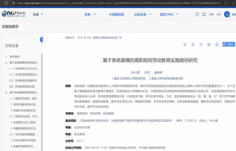 我国最具影响的职教刊物之一《职教论坛》发表了我校仲小瑾、王艳、蒯海章等人撰写的论文《基于系统基模的高职院校劳动教育实施路径研究》。