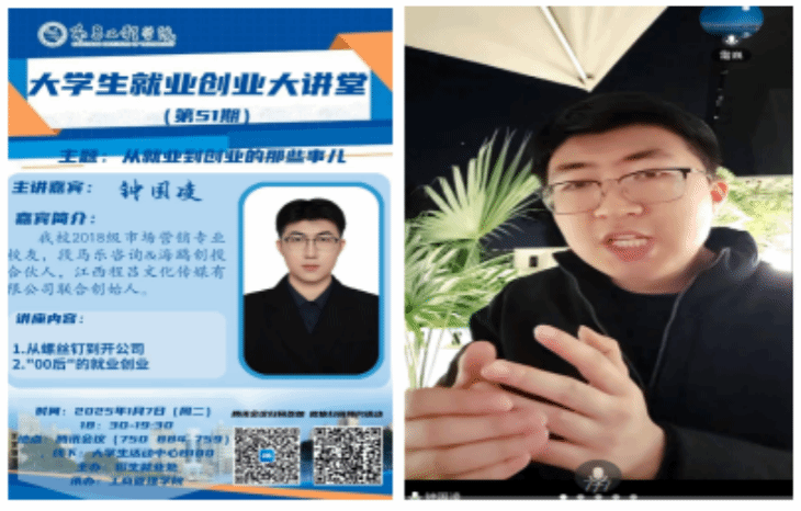 1月7日晚,由威廉希尔处主办,我院承办的第51期“大学生就业创业大讲堂”活动在大学生活动中心B100开讲。本次活动邀请到了段马乐咨询&海鸥创投合伙人、江西程吕文化传媒有限公司联合创始人、我校2018级市场营销专业校友钟国凌主讲。此次活动由辅导员雷巍主持,全校90余名学生参加。