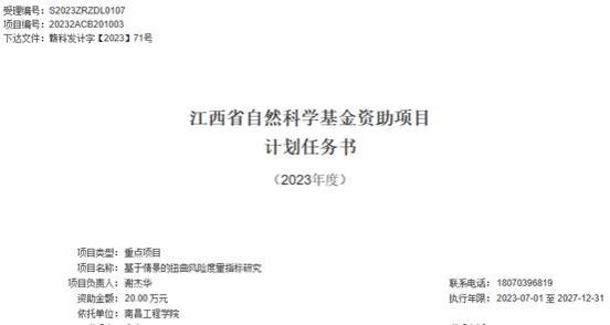 根据《江西省科学技术厅关于下达2023年省级科技专项资金(科技计划第二批)项目的通知》(赣科发计字〔2023〕71号)的文件精神,我院谢杰华教授申报的项目《基于情景的扭曲风险度量指标研究》(批准号:20232ACB201003)喜获2023年江西省自然科学基金重点项目资助,经费20万元。