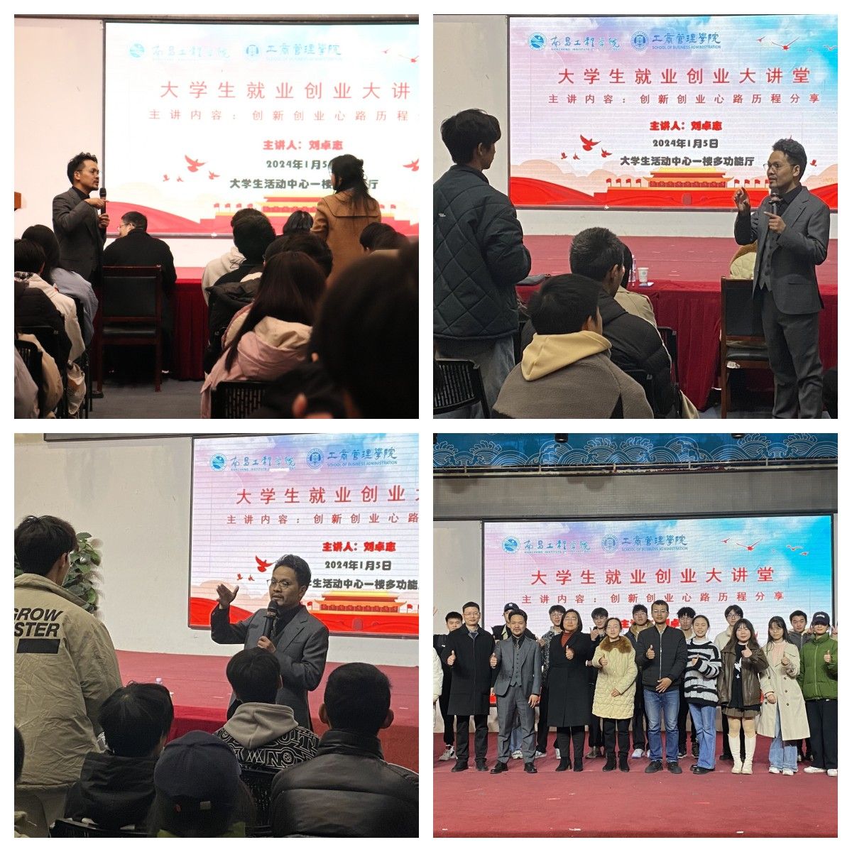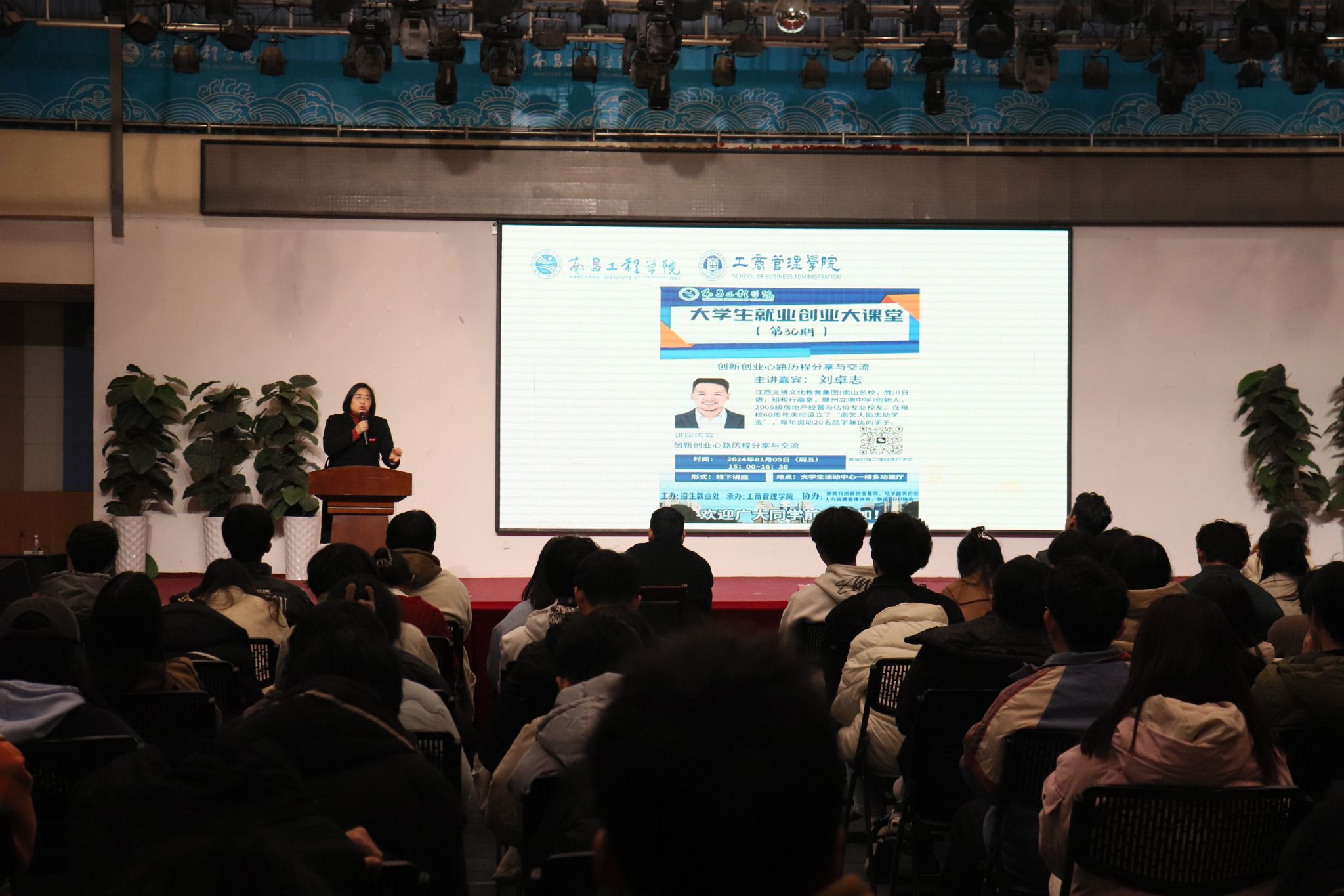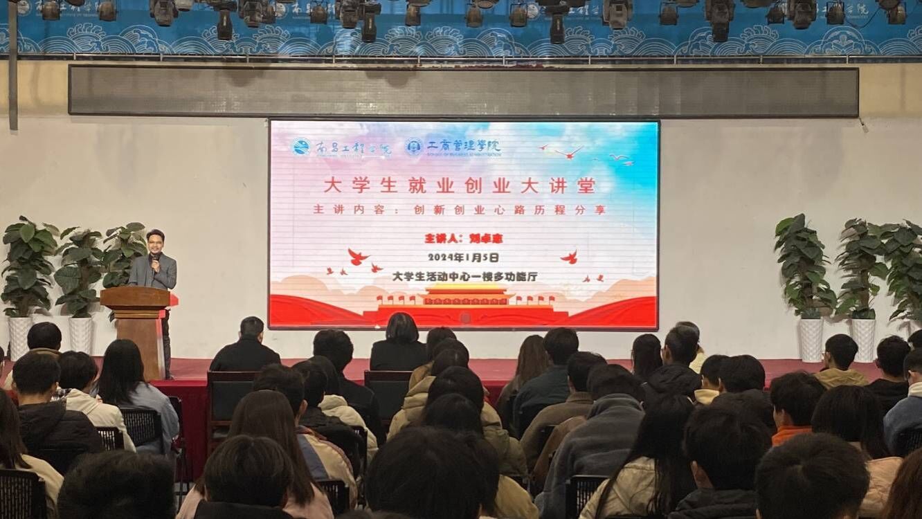 近日,第30期“大学生就业创业大讲堂”在大学生活动中心一楼多功能厅开讲。江西文贤文化教育集团(南山艺校,胜川日语,知和行画室,赣州立德中学)创始人、我院2005级房地产经营与估价专业校友刘卓志主讲。院党委书记高丽明、院党委副书记肖斯敏、相关专业老师及130余名学生参加此次活动。